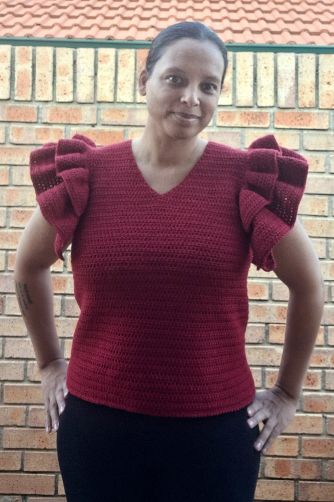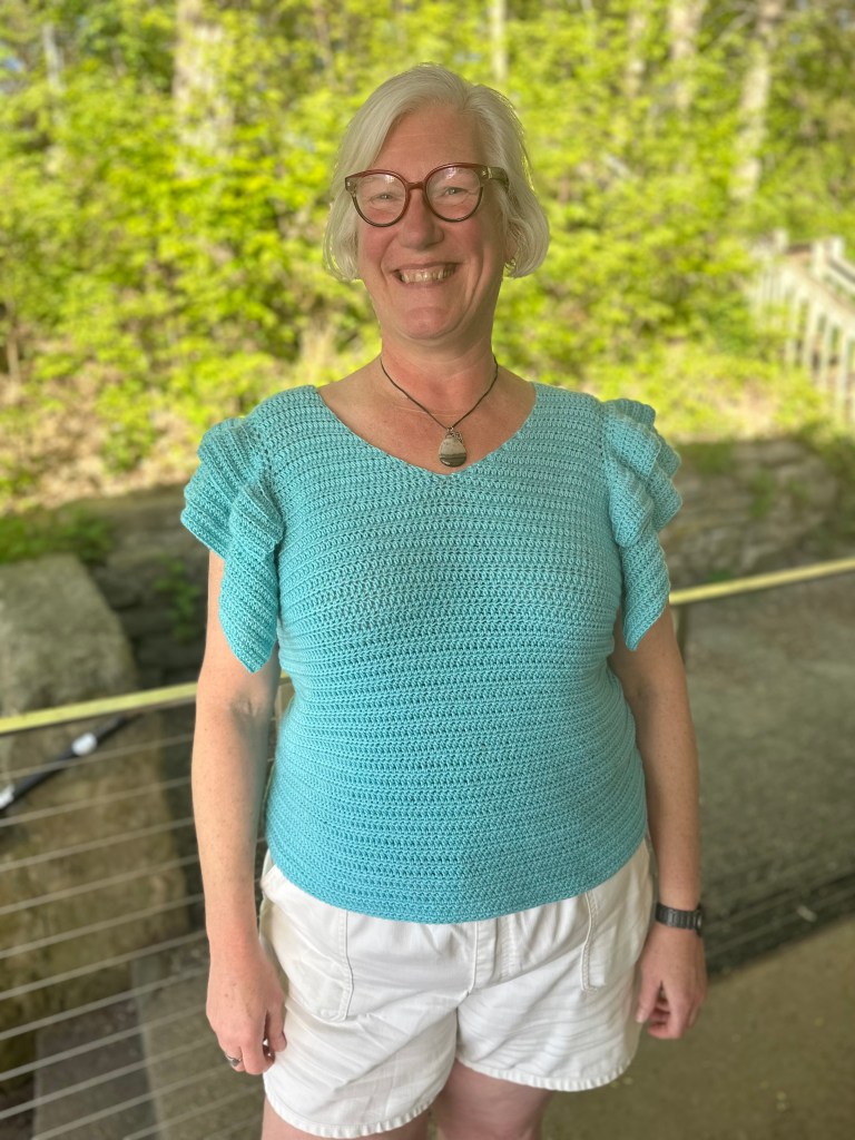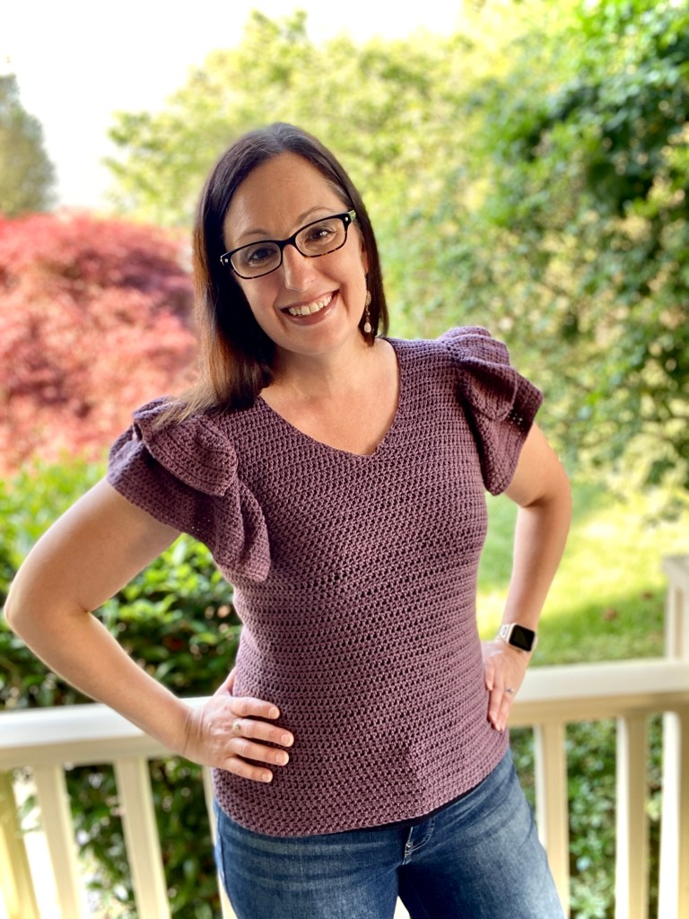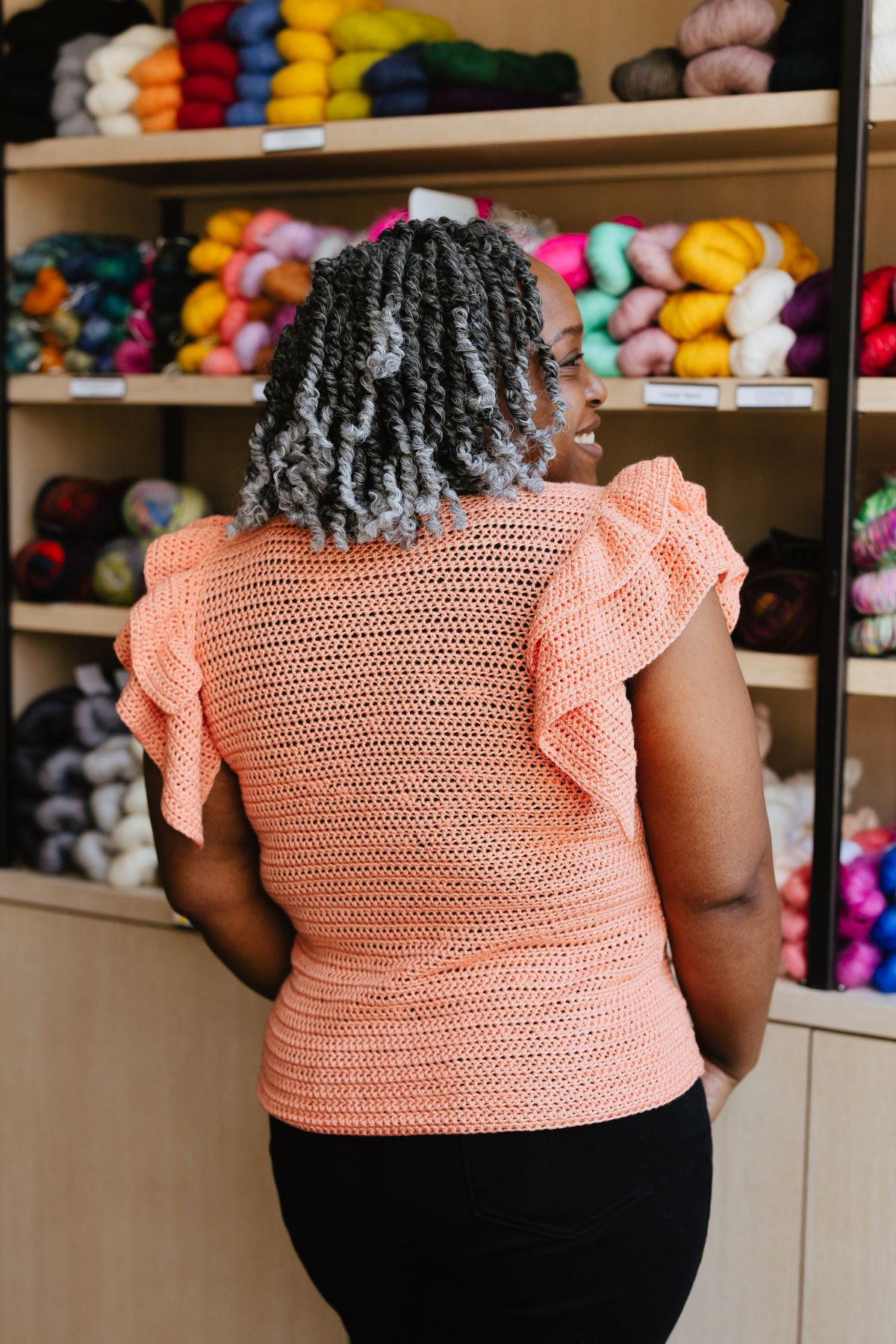 The double-layer ruffle brings a bit of whimsy. A couple of my testers used different colors for each layer. 😍 This top is worked top-down and intended to be worn with 0-2” (0-4 cm) of positive ease. We’re leaning into our curves this year, ok?